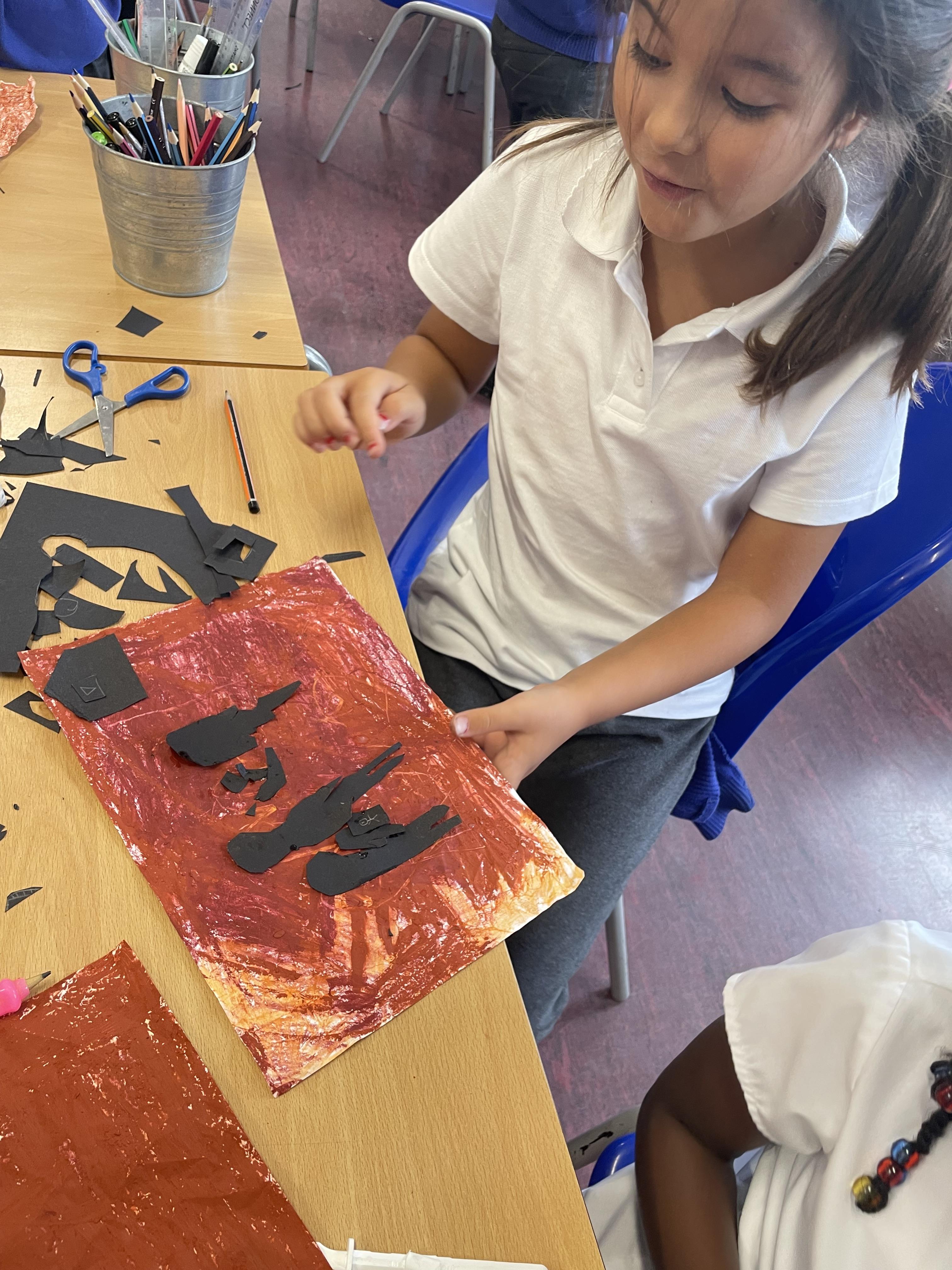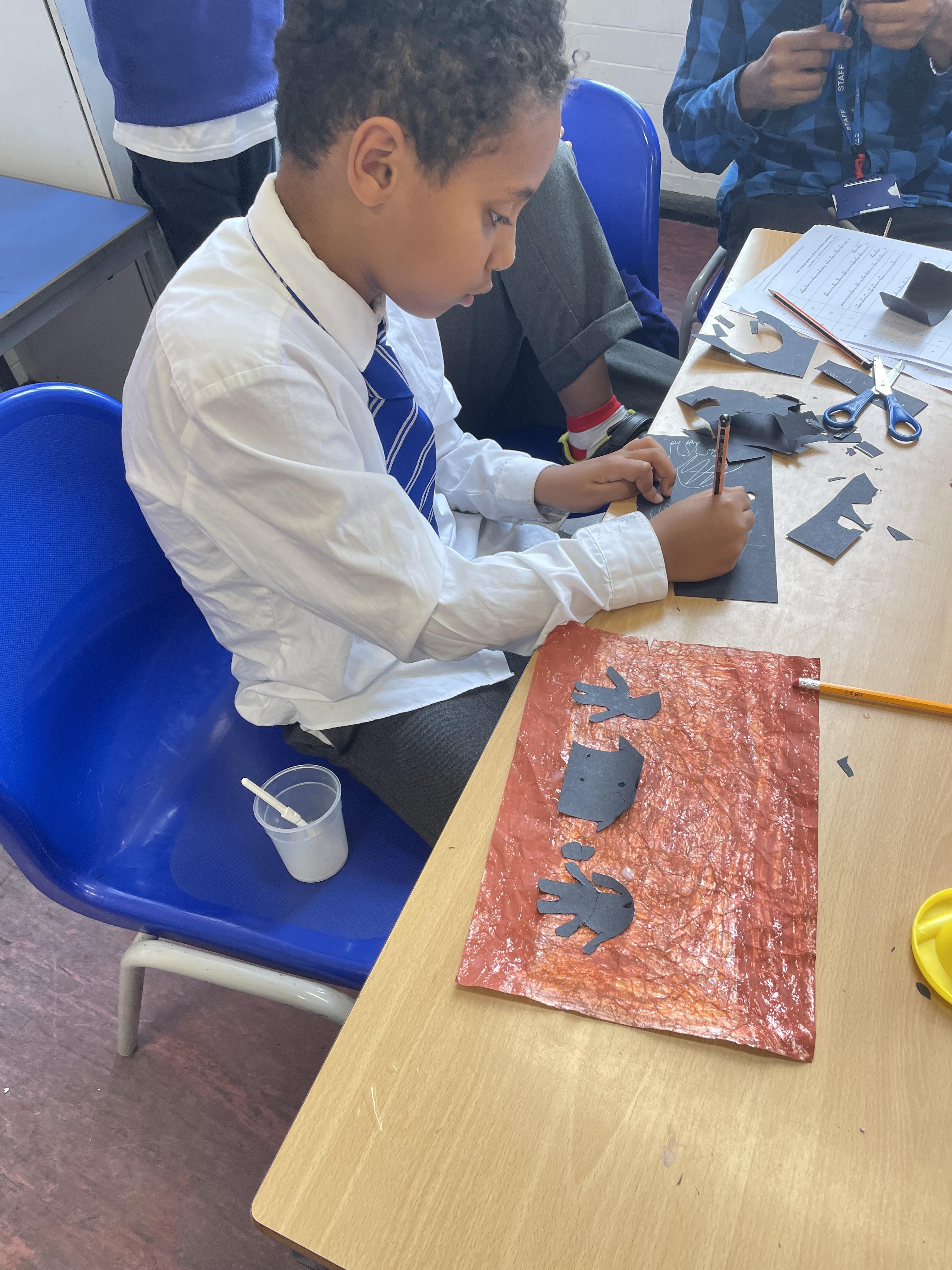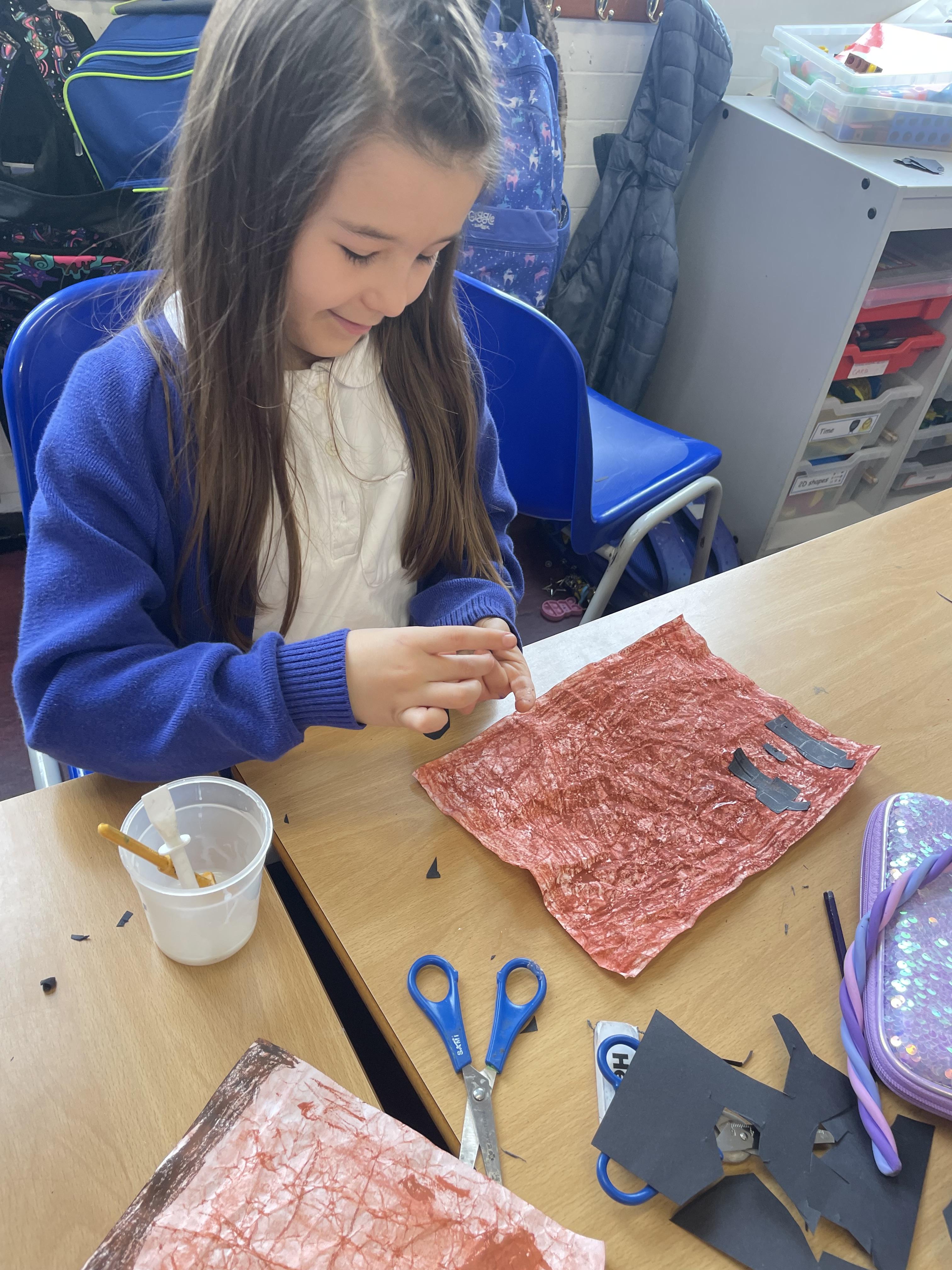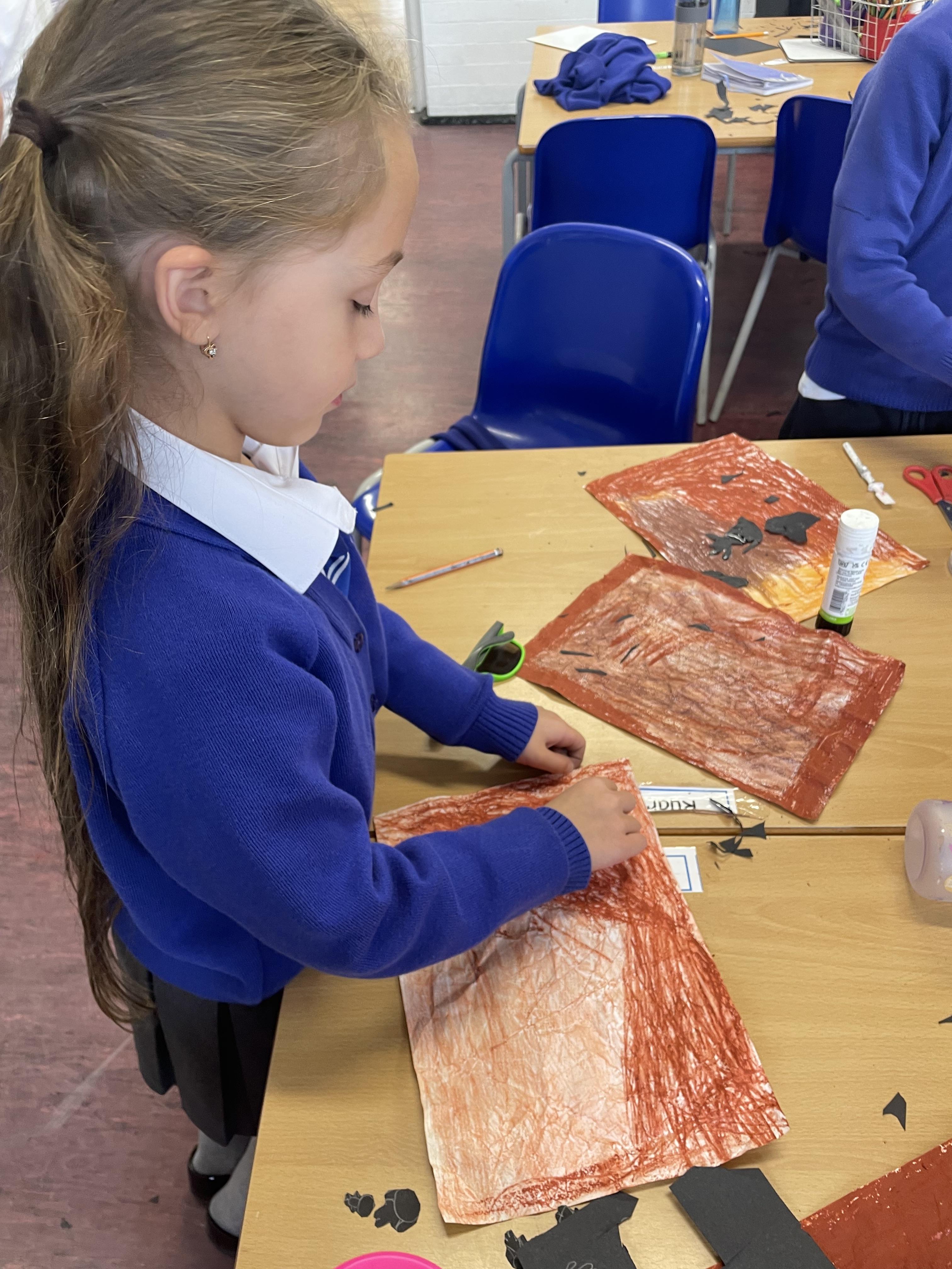 Cave Art- The children used a range of mediums to create a Cave surface, with cave cut outs of their life story.