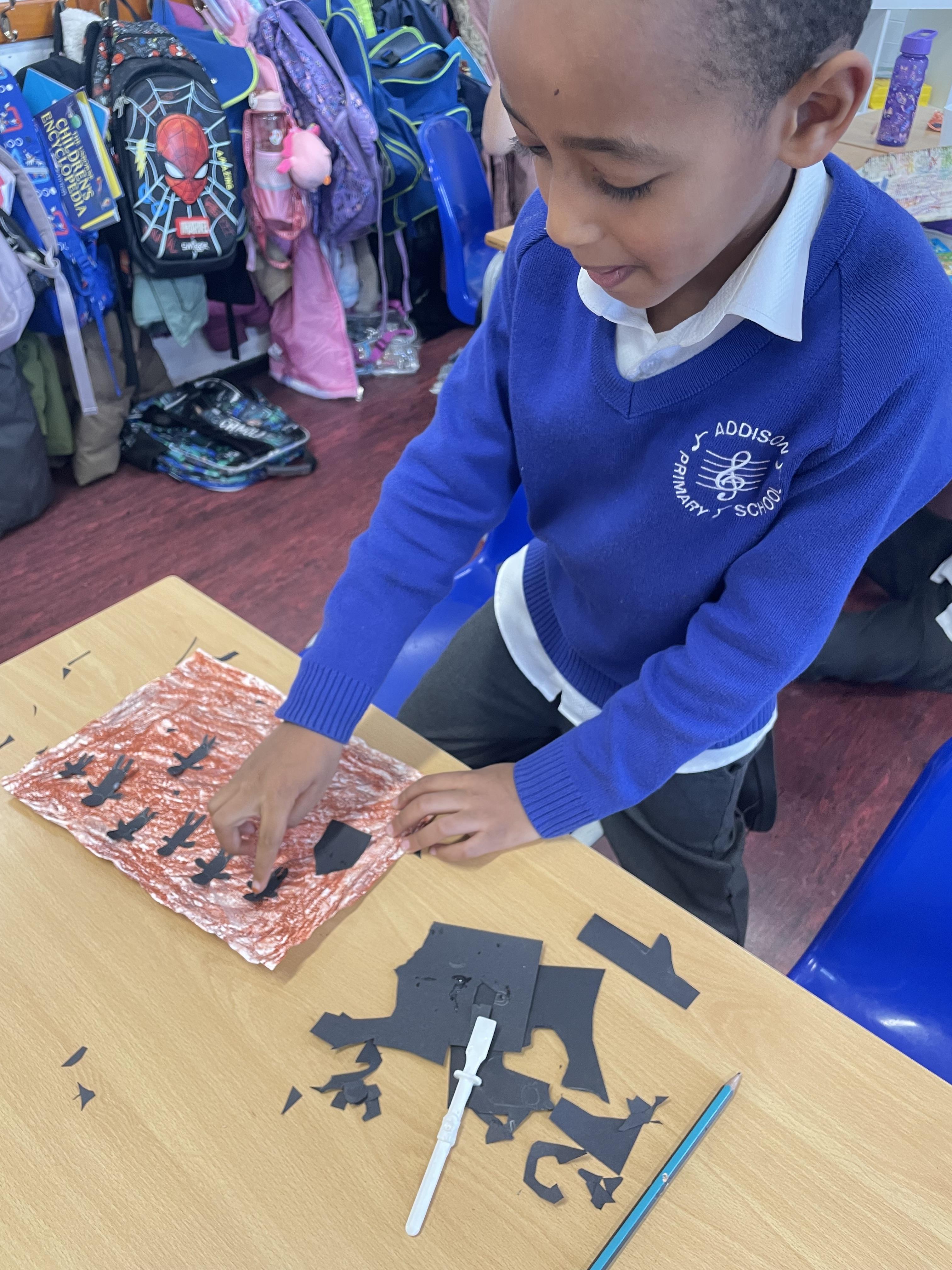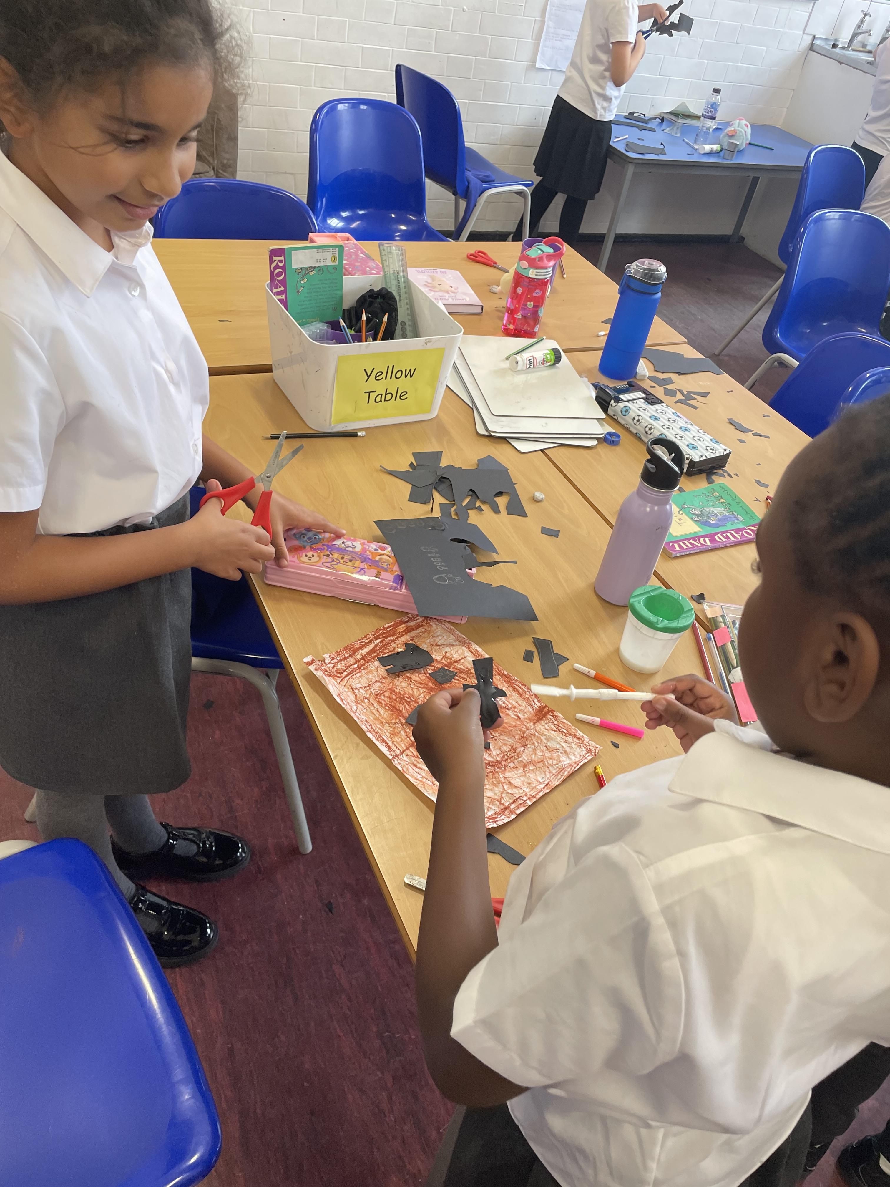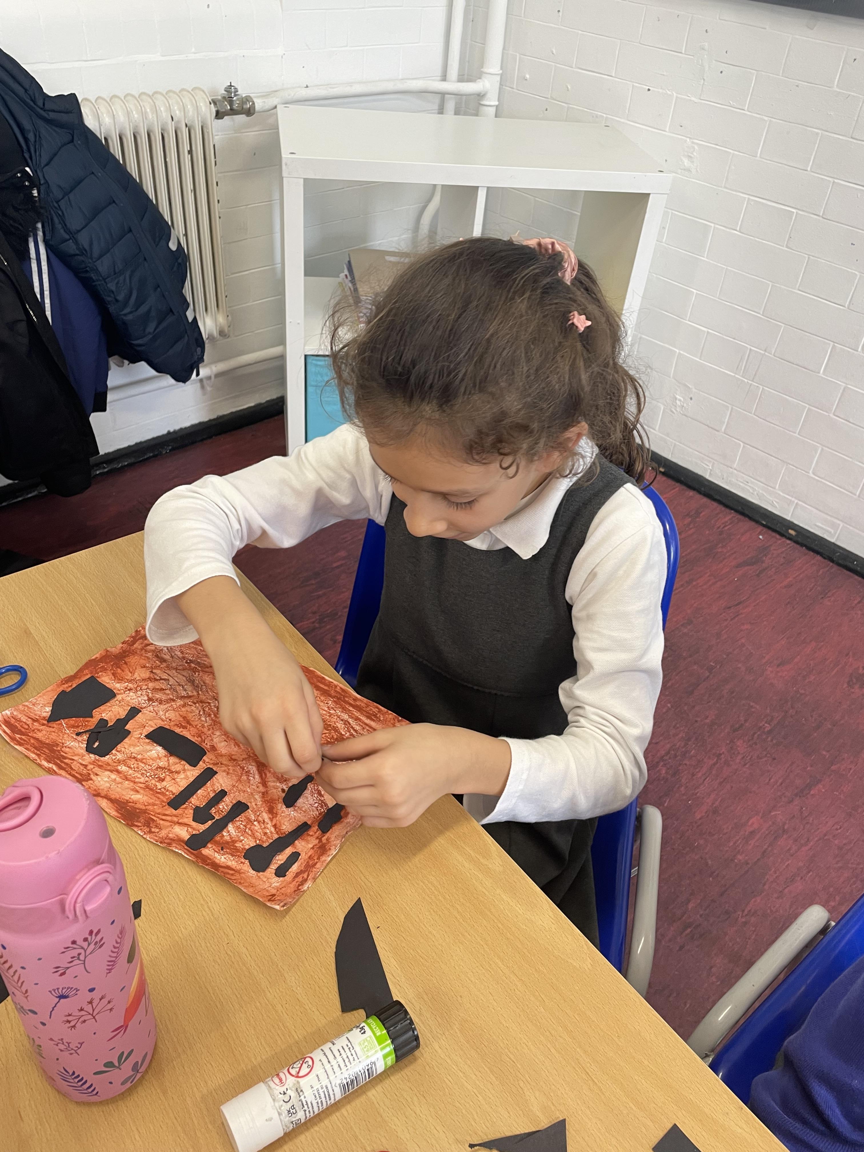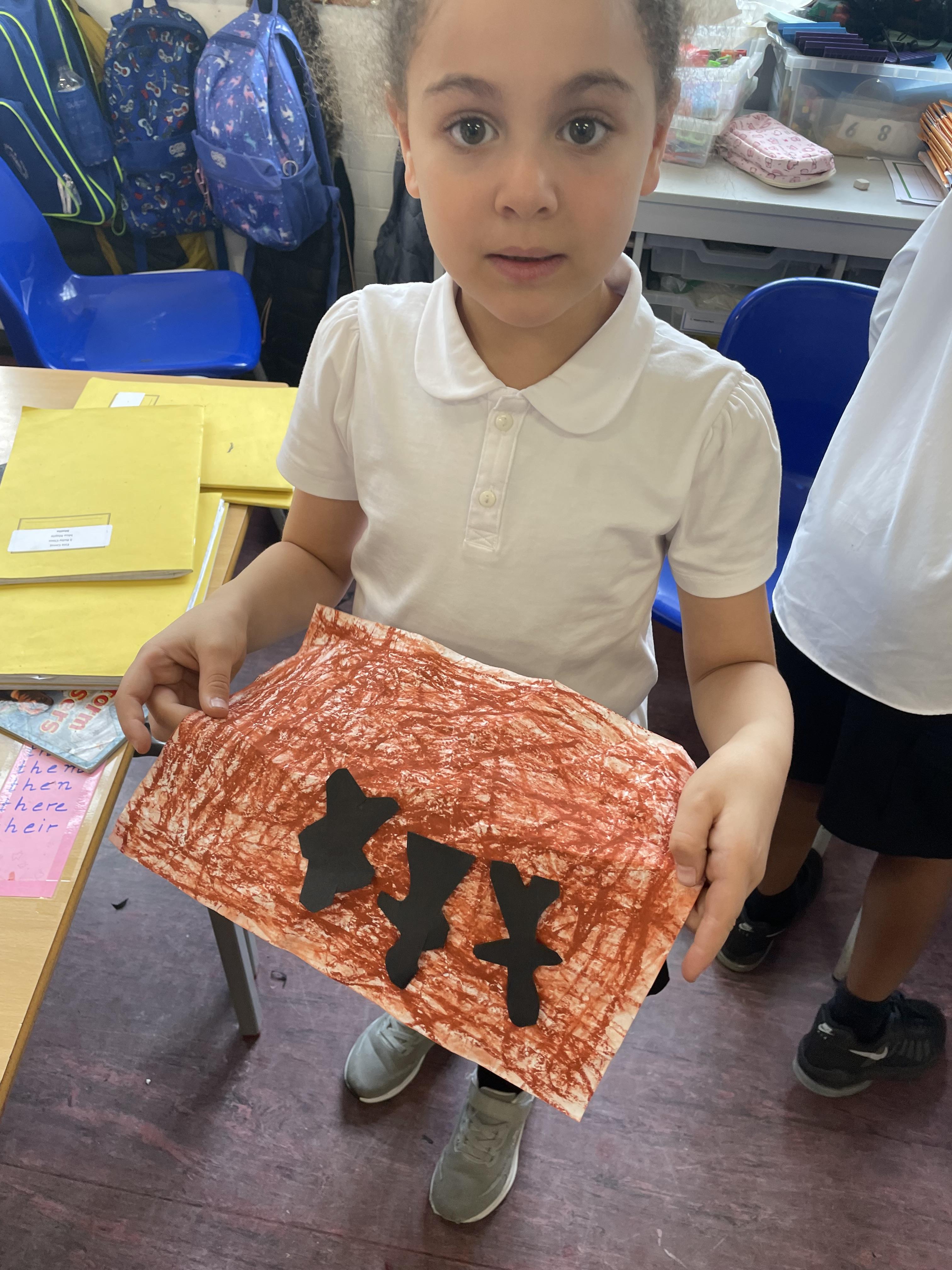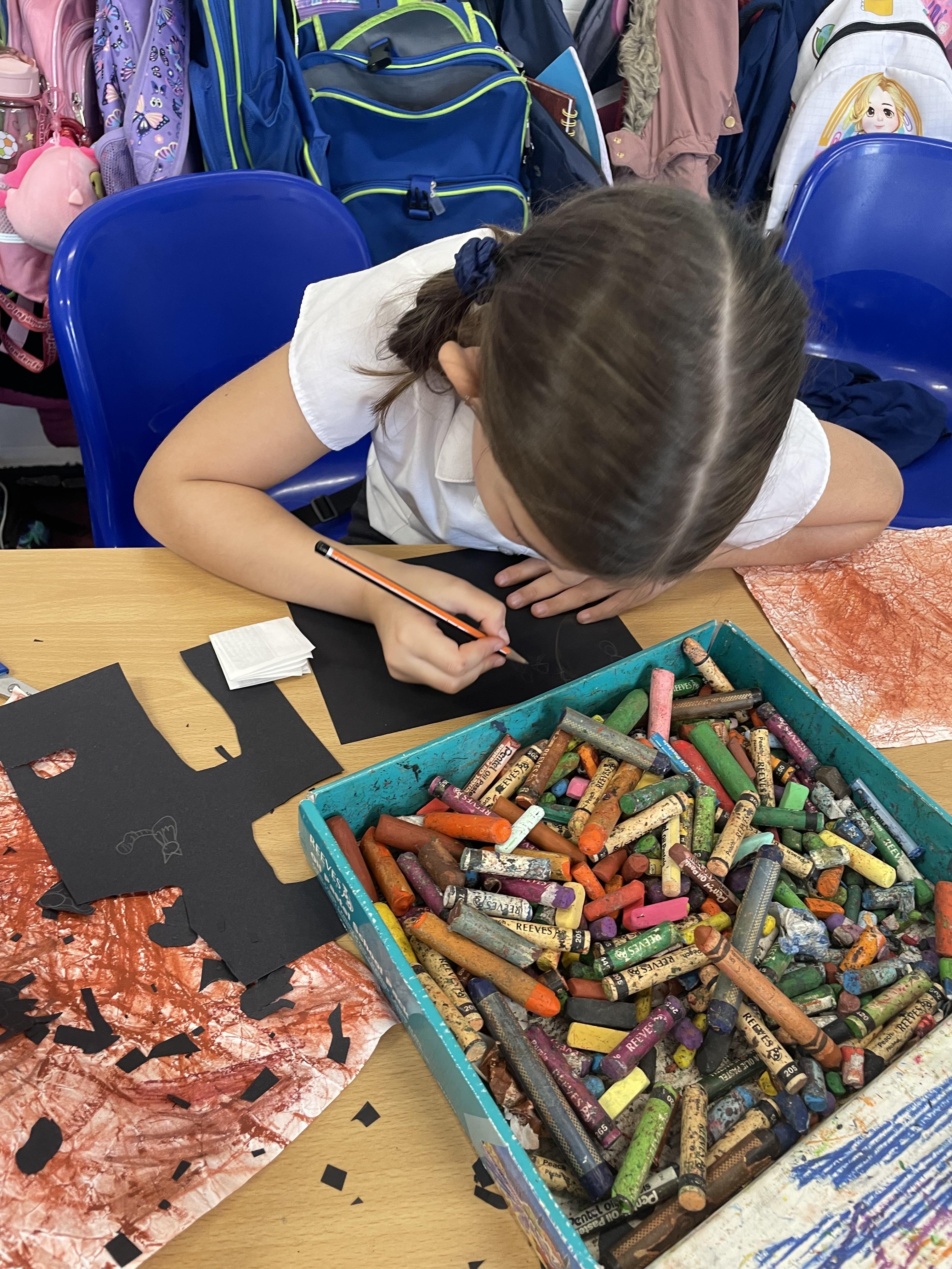 Cave Art- The children used a range of mediums to create a Cave surface, with cave cut outs of their life story.