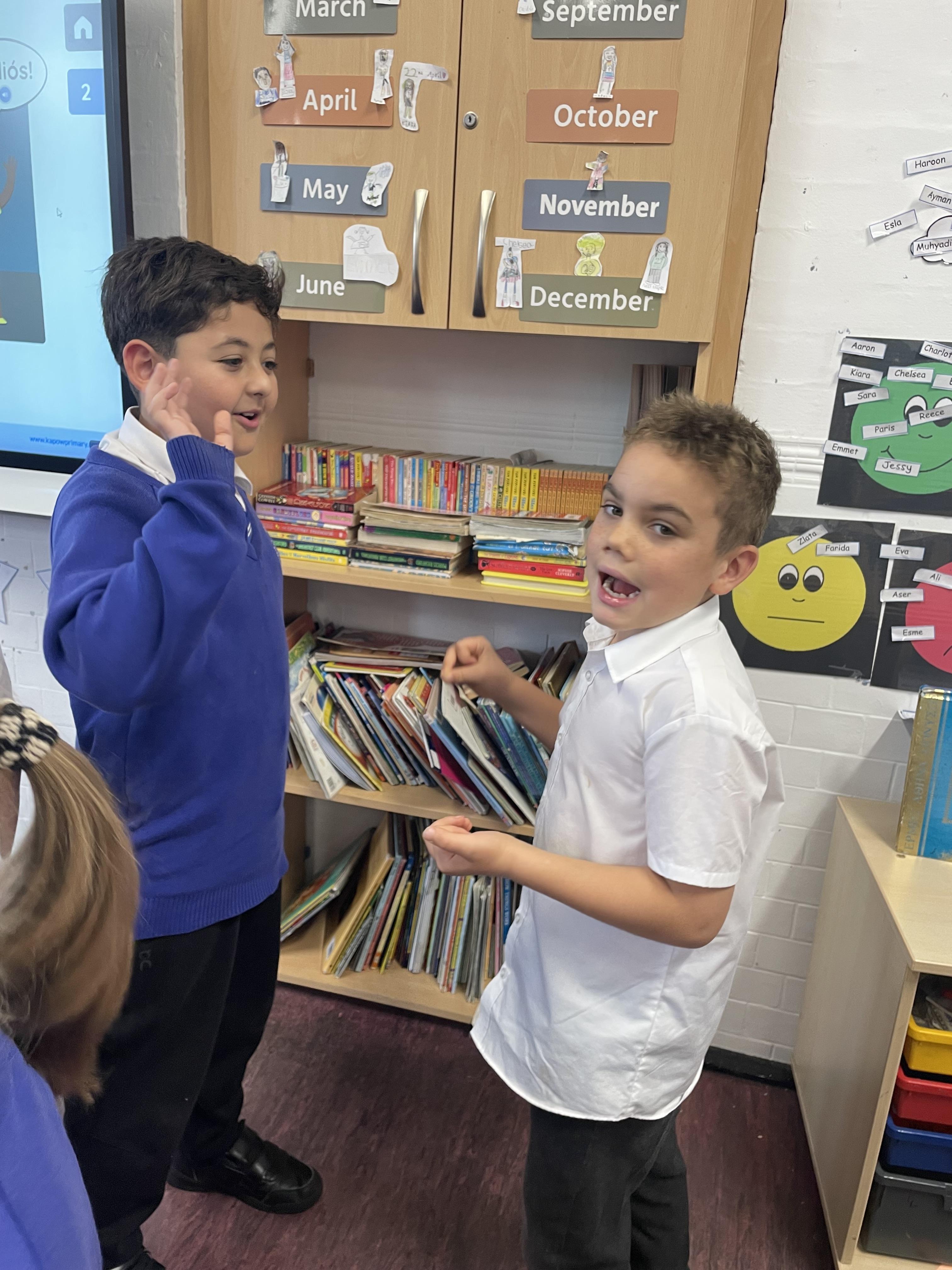 Spanish- We have been practicing our Spanish greetings. Hola!