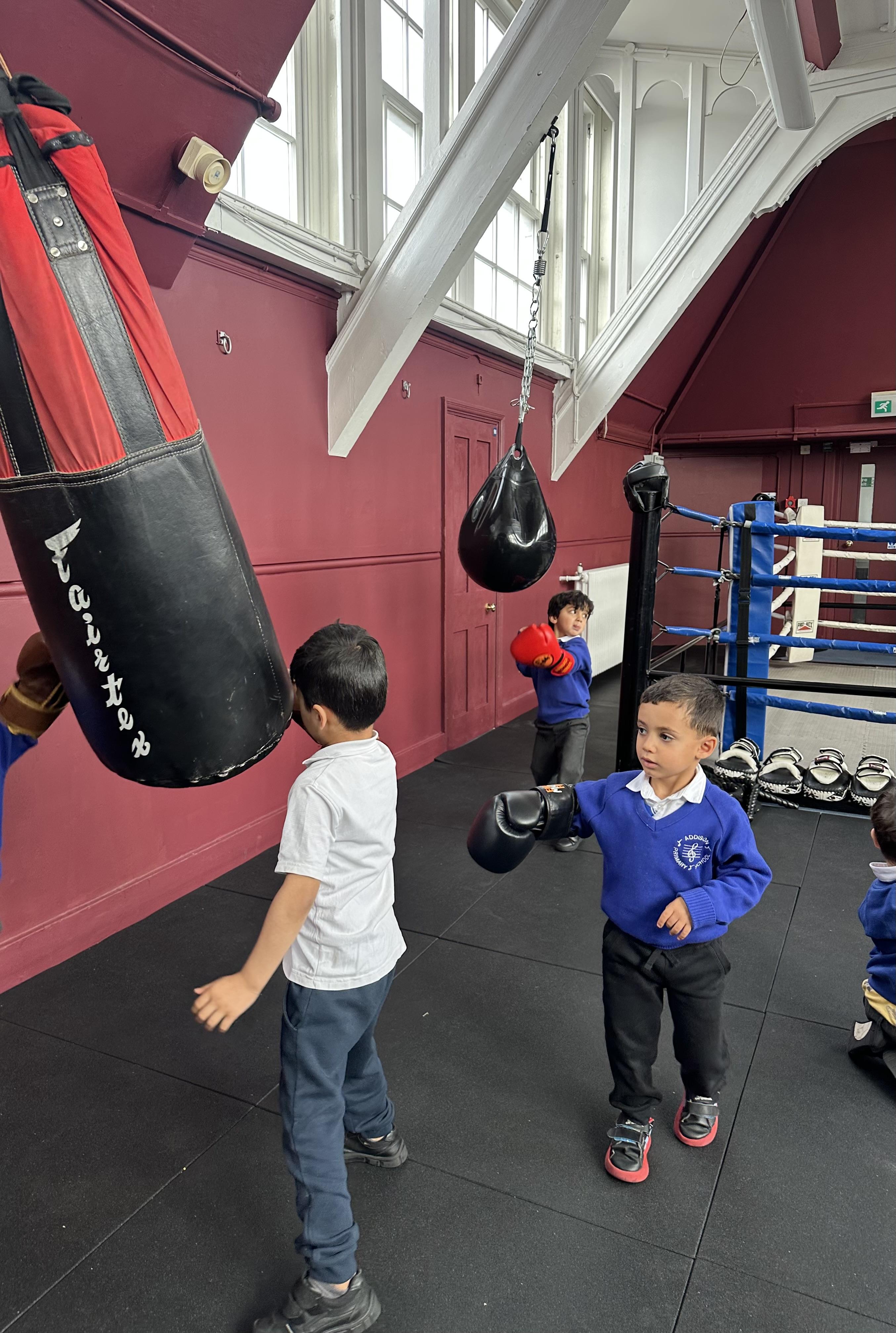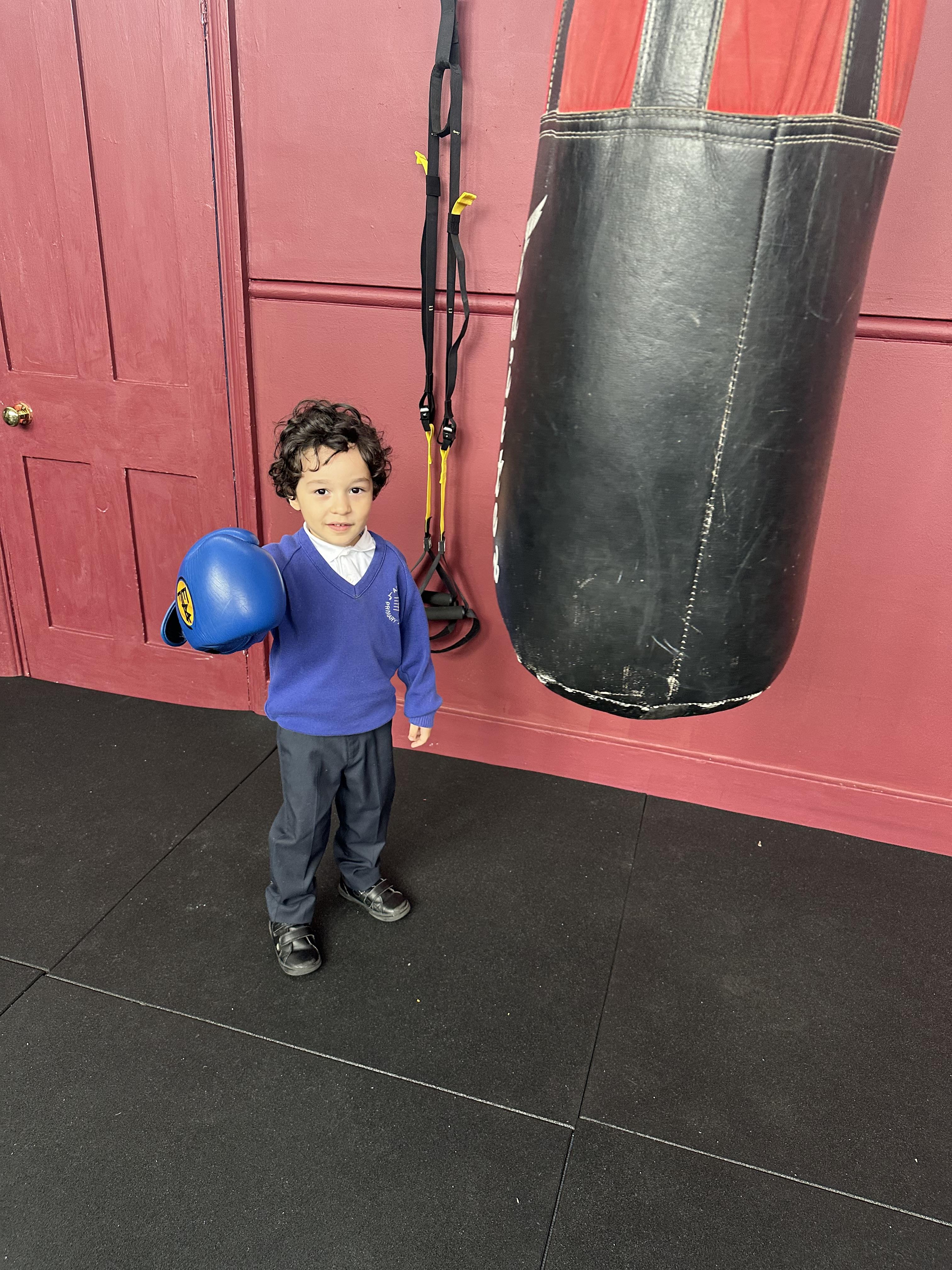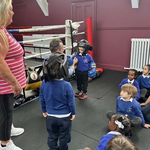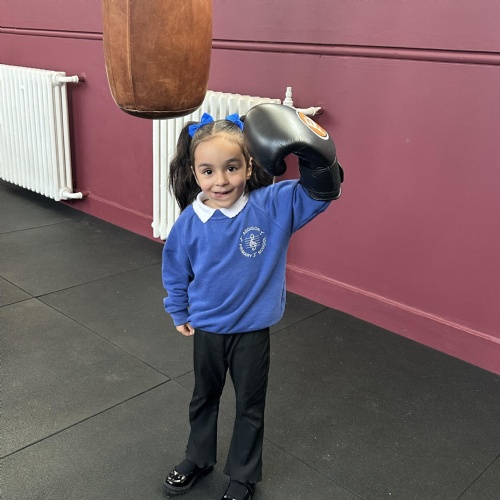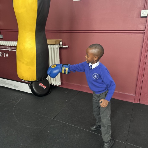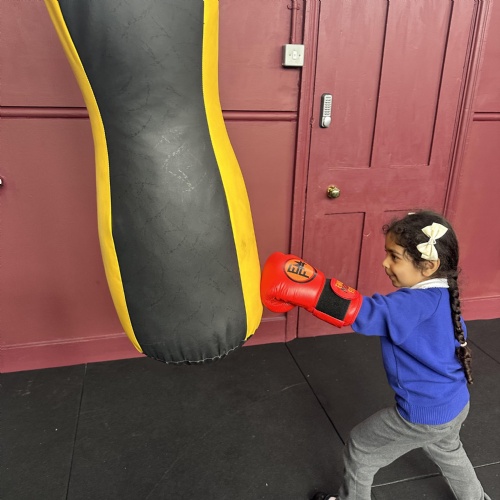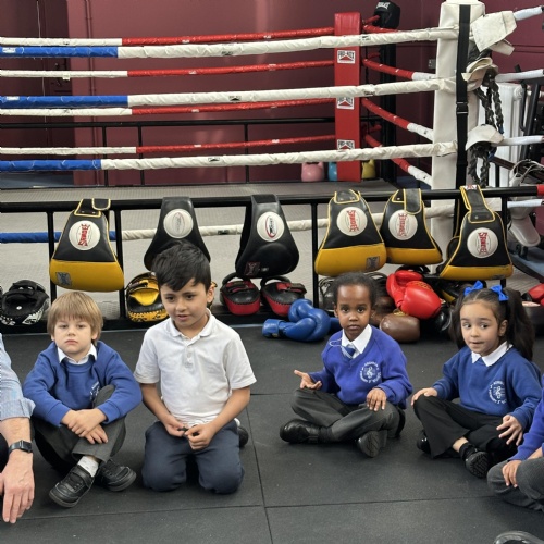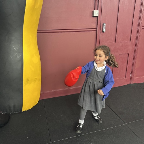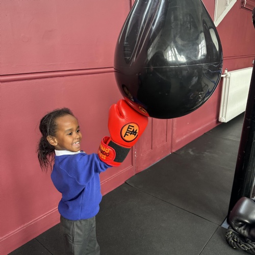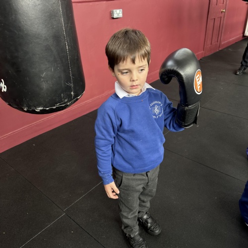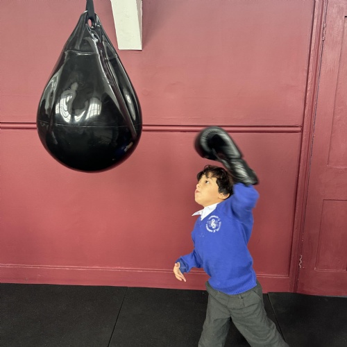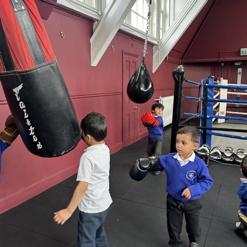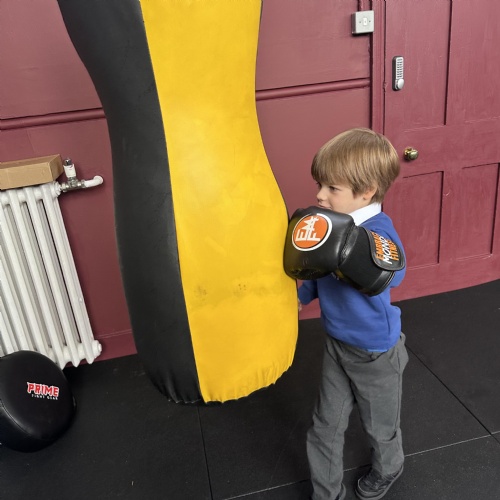 Reception had a very exciting experience visiting the ‘secret room’ right at the top of Addison. We climbed, climbed some more, climbed some more, climbed some more until there were no more steps left to take. Once inside, the children had the opportunity to put on gloves and try out the punch bags. This opportunity was linked to their PE learning, where pupils had been developing their warm-up skills by practising controlled boxing movements.
