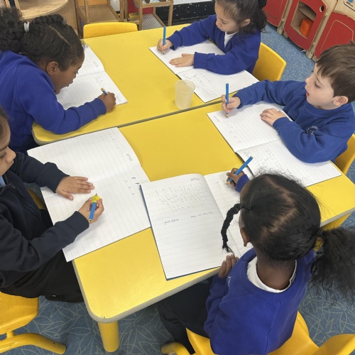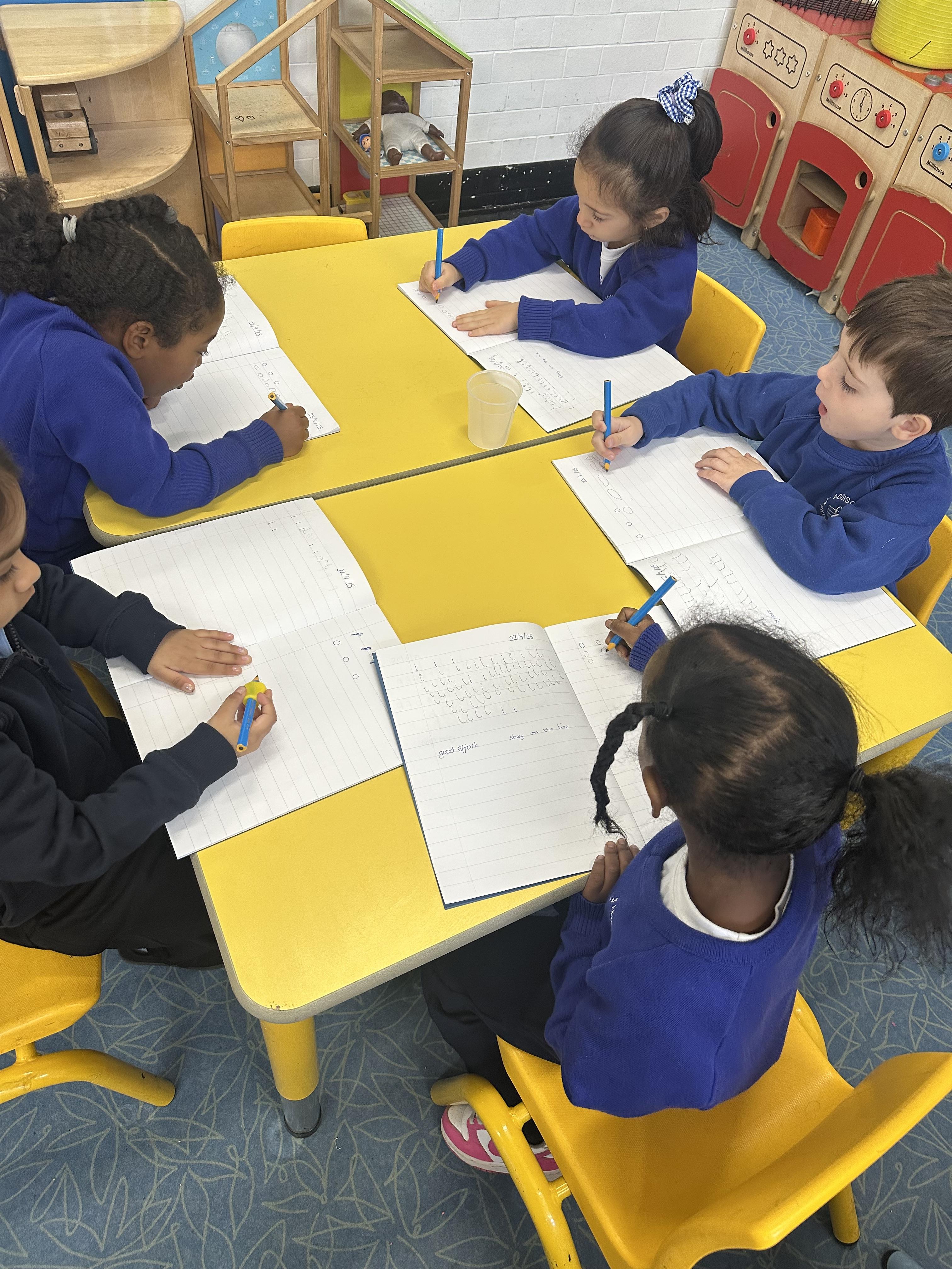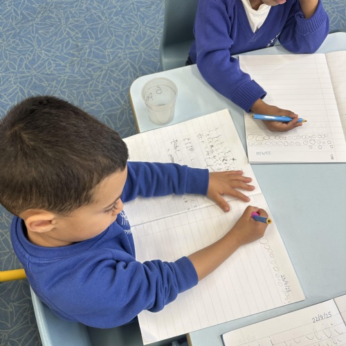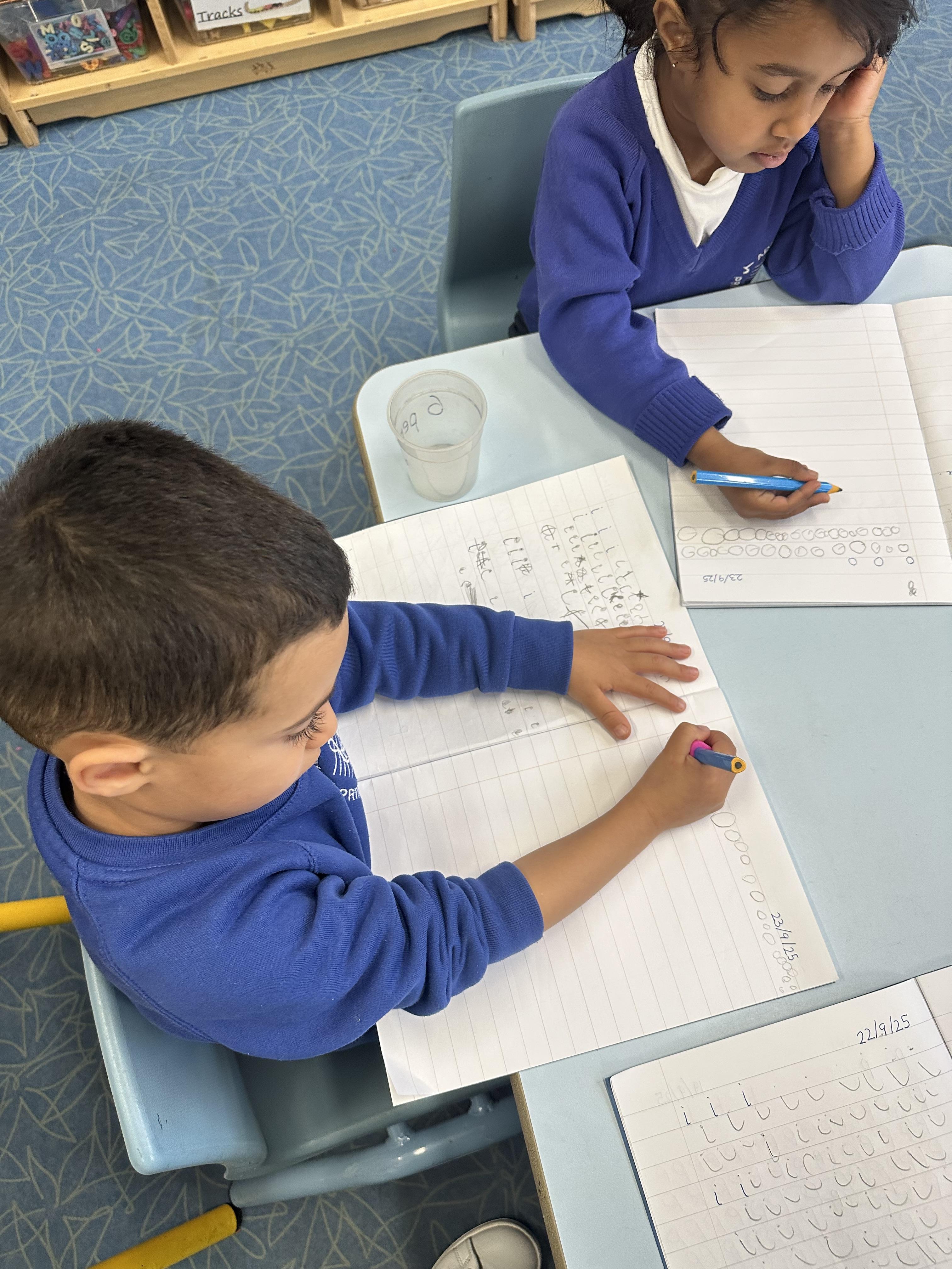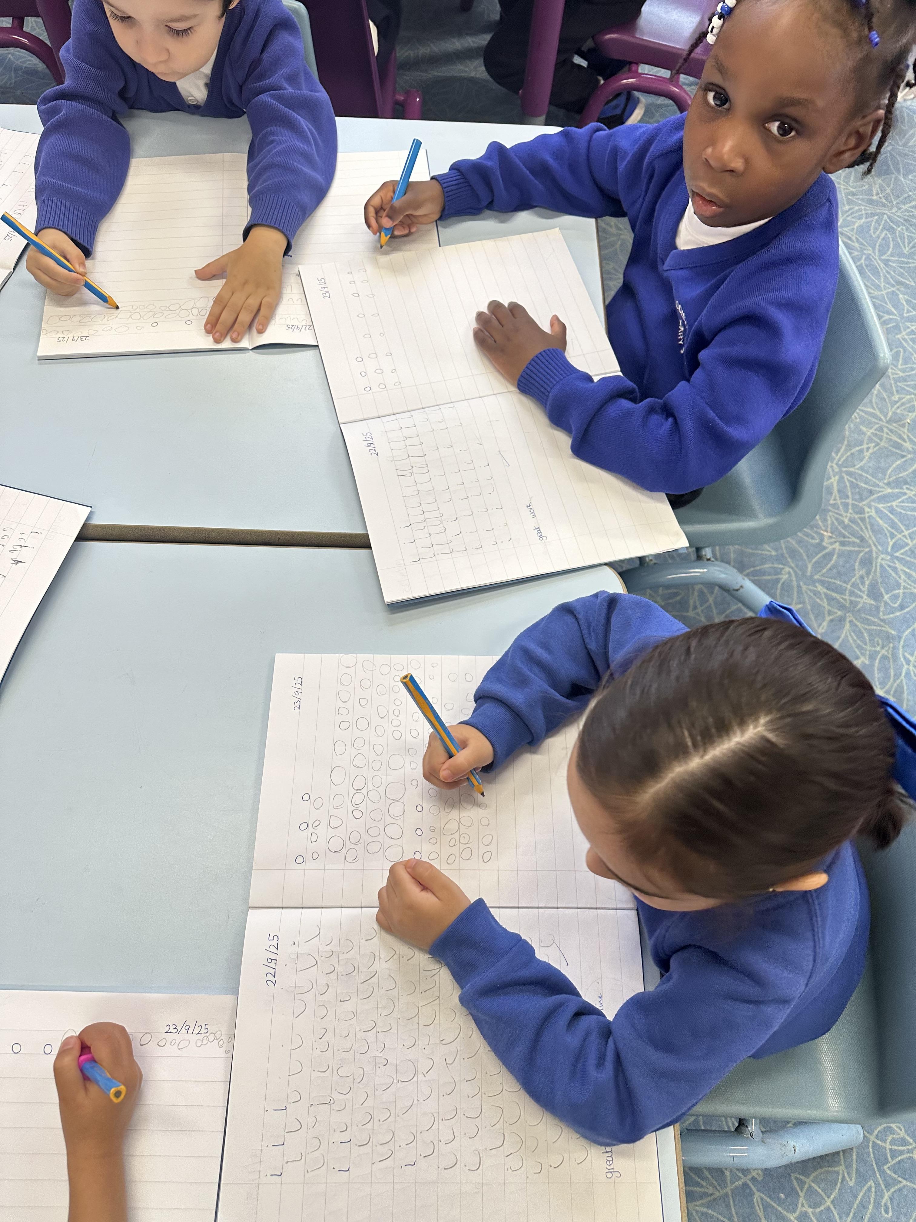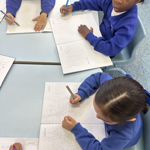 Our Reception children are practising their Set 1 sounds in a whole-class handwriting session, remembering to use their tripod grip.