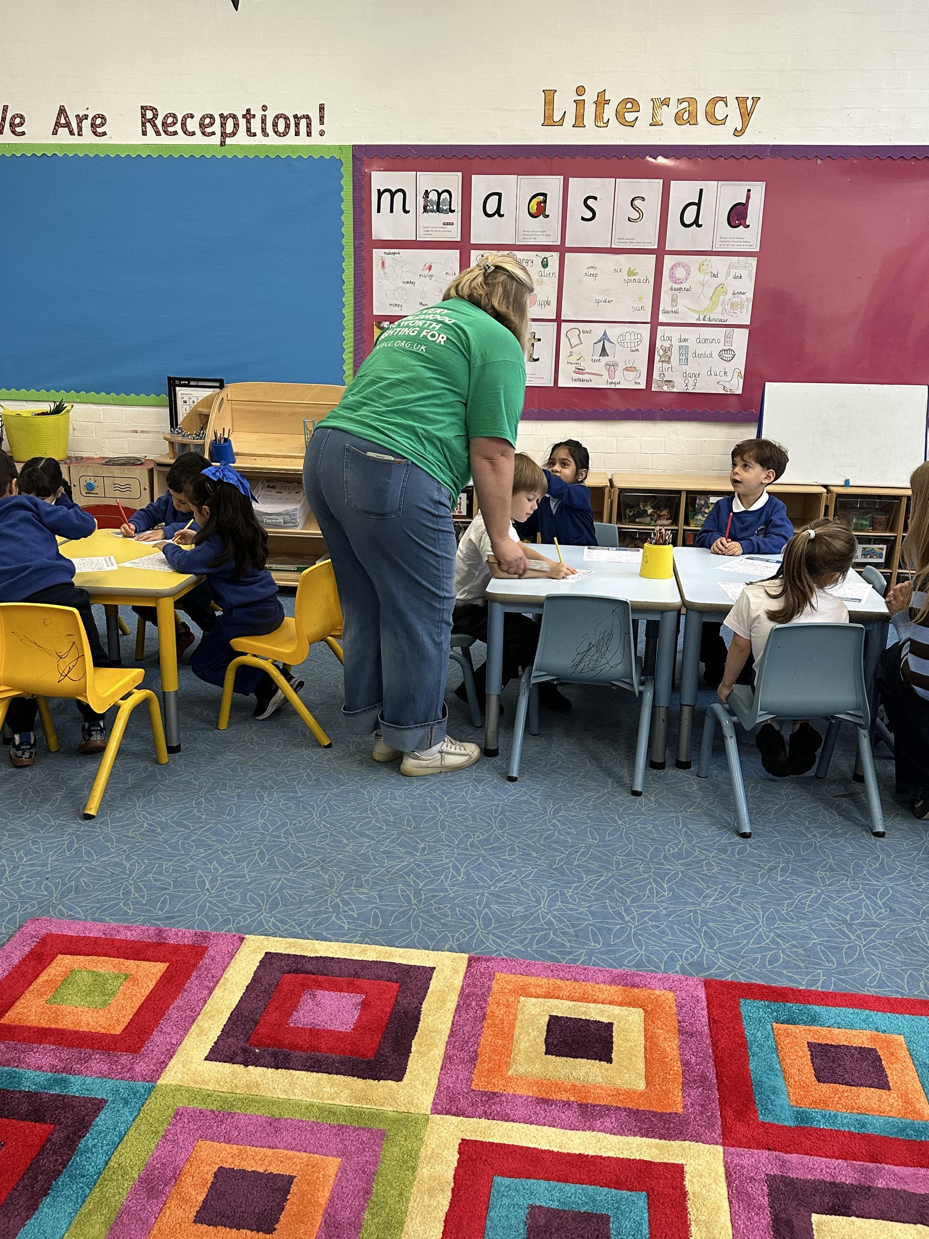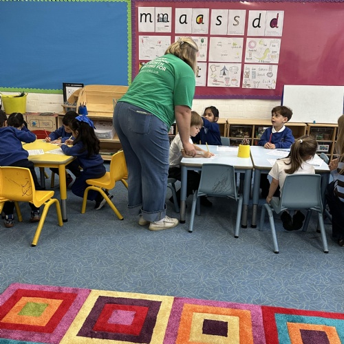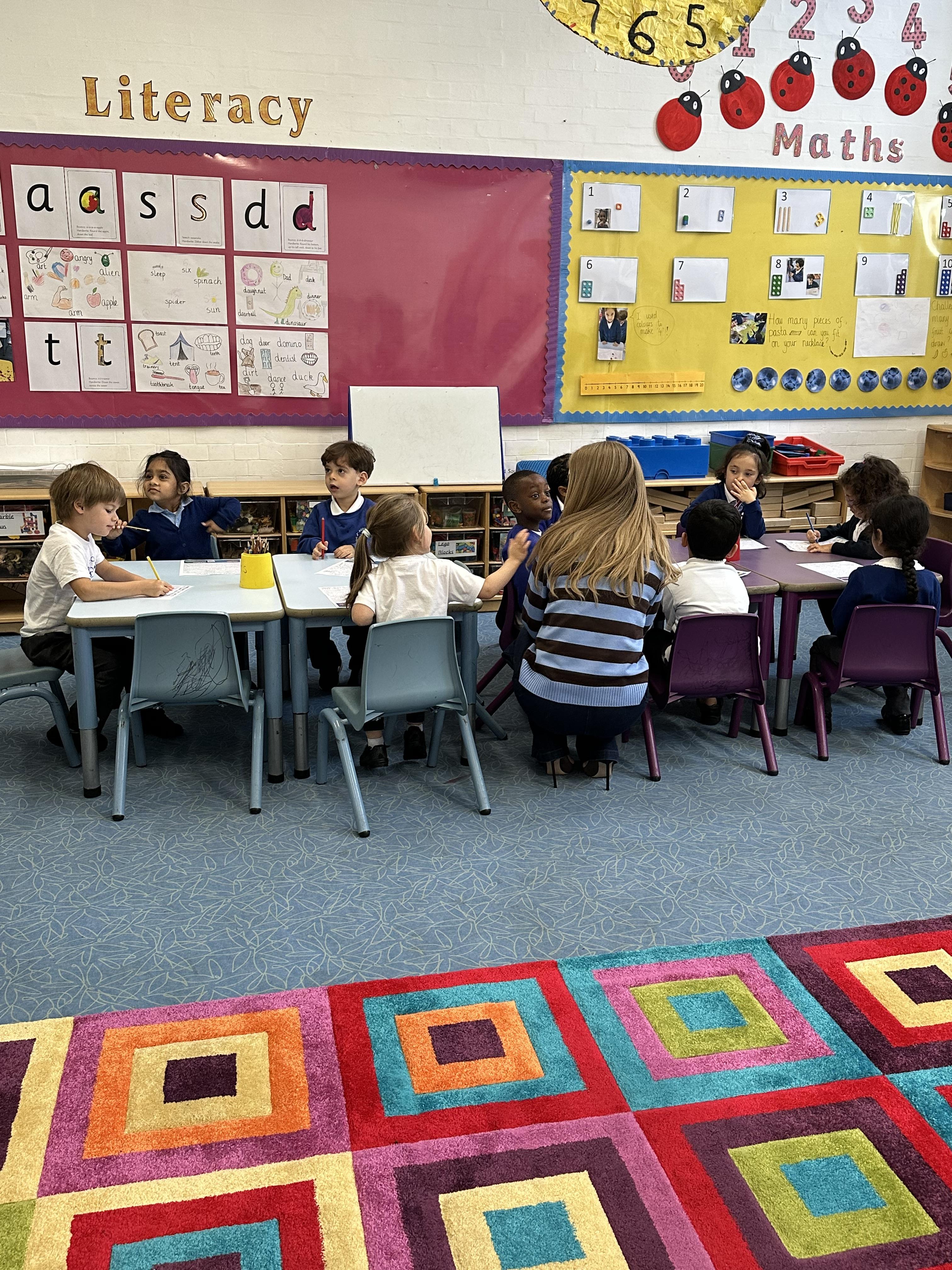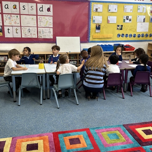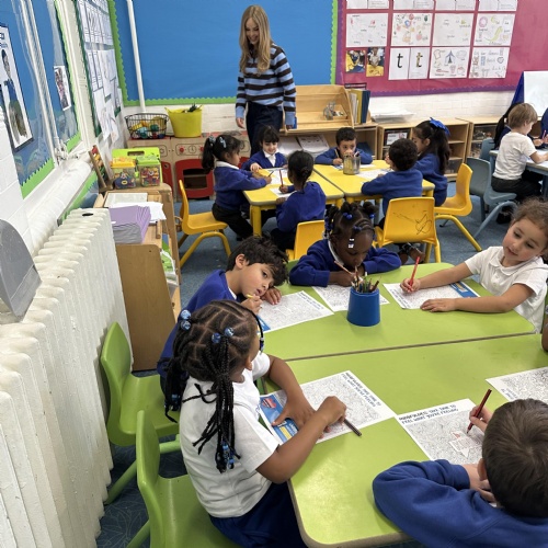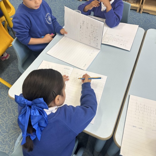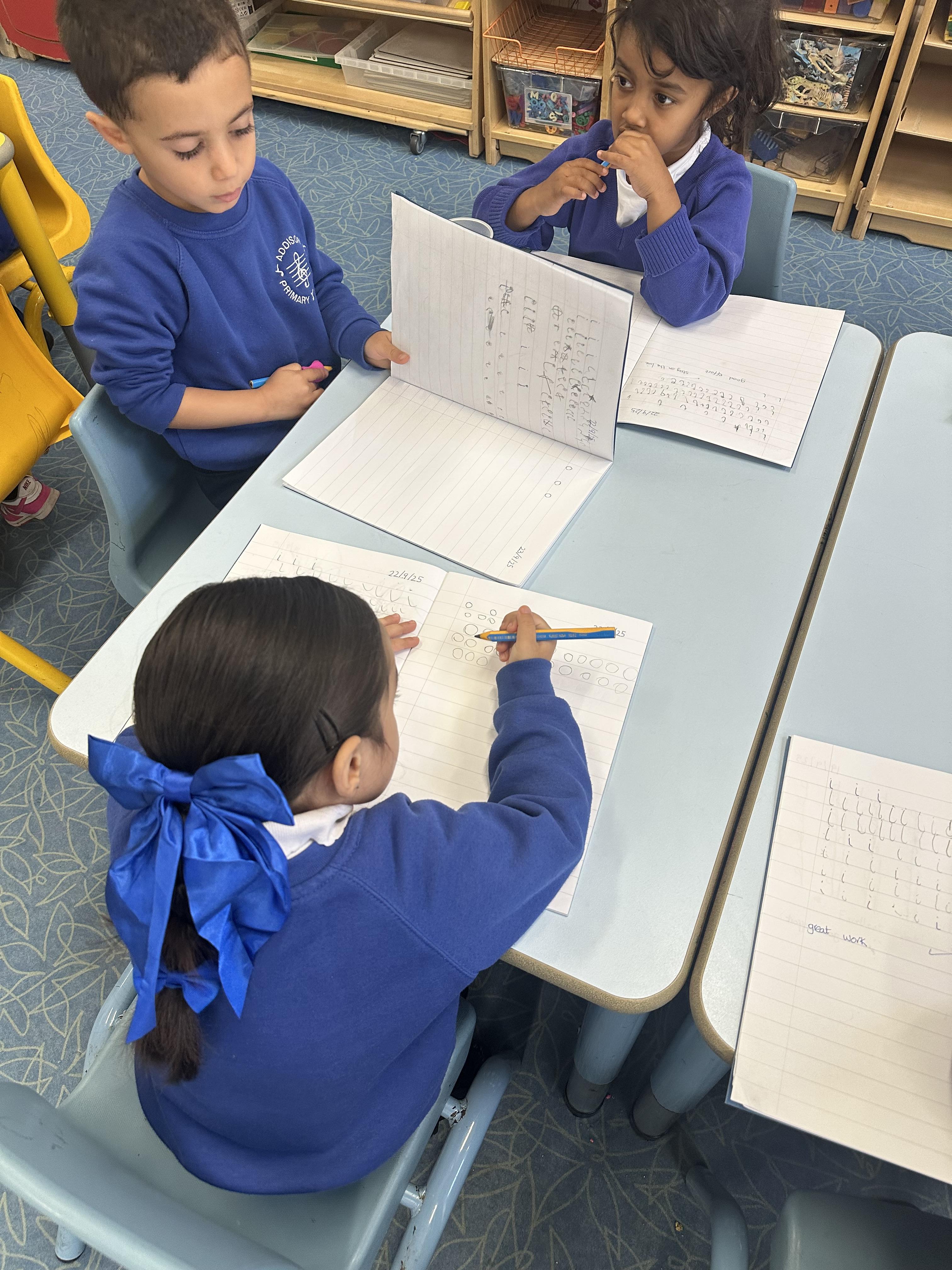 Our Reception children are practising their Set 1 sounds in a whole-class handwriting session, remembering to use their tripod grip.