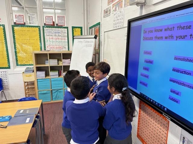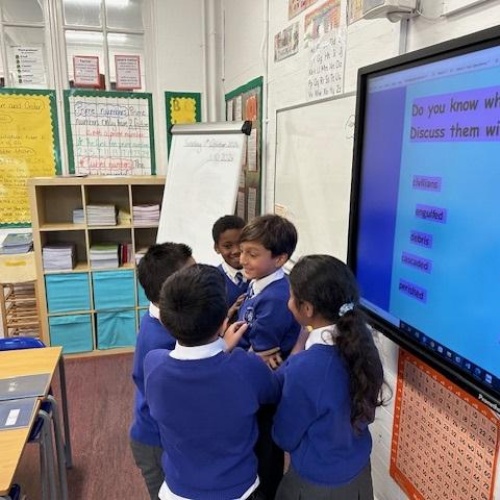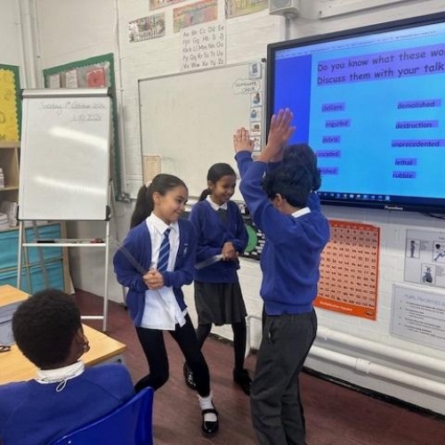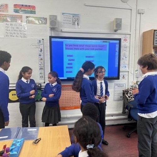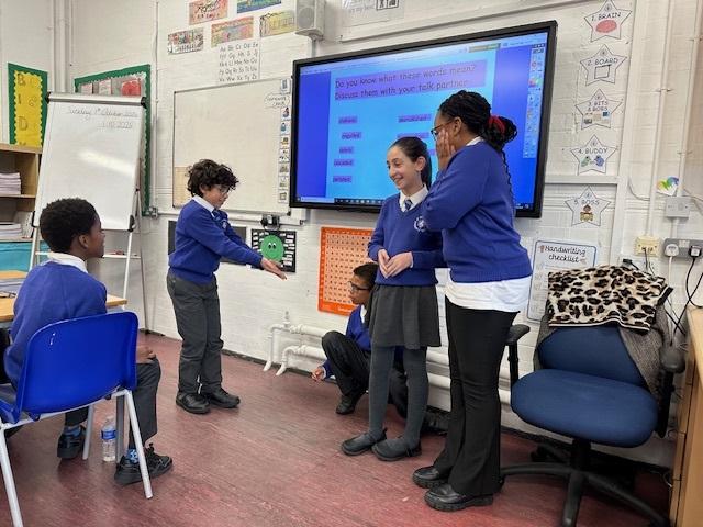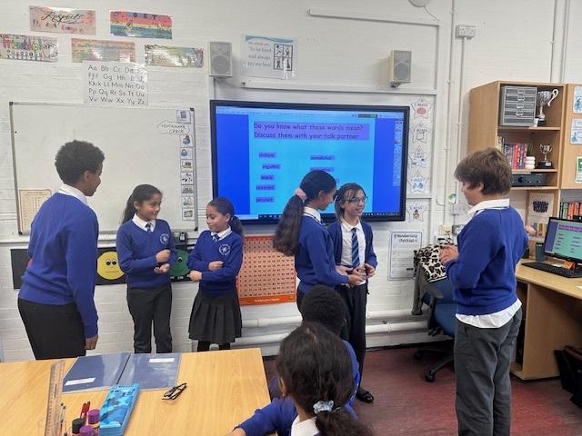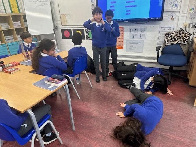 In English we were learning our new vocabulary words to help us with our writing. We used drama to help us learn these words and presented them to the class.